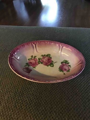 Vintage Oval Ceramic Basin with Rose Decal and Scalloped Lustre Rim