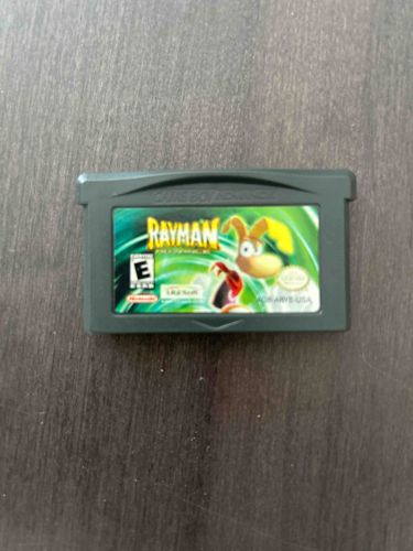 This is an original game cartridge for 'Rayman Advance', released for the Nintendo Game Boy Advance (GBA) handheld console. The item is constructed from dark charcoal grey injection-molded plastic and measures approximately 1.3 by 2.3 inches. The front features a glossy adhesive label with vibrant green and yellow artwork depicting the character Rayman against a swirl background. Notable markings include the 'Rayman' title logo, an ESRB 'E' (Everyone) rating, the Ubi Soft Entertainment logo, and the official Nintendo Seal of Quality. The lower right corner of the label displays the product code 'AGB-ARVE-USA', indicating a North American release. The plastic casing has the 'GAME BOY ADVANCE' branding embossed at the top and a downward arrow for insertion guidance at the bottom. Regarding condition, the cartridge appears well-preserved with sharp corners on the label and minimal surface scuffing on the plastic housing. The metallic gold contacts at the bottom, though not fully visible, show a hint of expected insertion wear. This title was a launch game for the GBA in 2001, making it over two decades old. The label printing appears authentic with correct color saturation and font spacing, suggesting it is an original production rather than a contemporary reproduction.