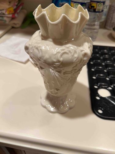This item is a vintage decorative vase manufactured by Belleek Pottery of Ireland. It is crafted from the signature ivory-colored Parian china, renowned for its thin, translucent walls and lustrous, pearlescent glaze. The vase features a high-relief embossed body with intricate floral or scrolling acanthus designs and a pronounced ruffled or scalloped 'tulip' rim. The form tapers down from a wide shoulder to a narrow stem, supported by a circular, scalloped pedestal foot. The cream-toned porcelain exhibits a subtle satin-to-glossy finish characteristic of high-quality Irish ware. While specific maker's marks are likely located on the underside of the base (common markers include the Wolfhound, Round Tower, and Harp), the overall craftsmanship suggests a mid-to-late 20th-century production. The condition appears sound with no visible hairline fractures or significant chips along the delicate ruffled edge, which is a common area for damage. The nacreous luster remains vibrant, indicating well-preserved glaze without significant abrasions or chemical dulling. The piece exemplifies the Victorian-influenced aesthetics traditionally associated with the Irish potteries of County Fermanagh.