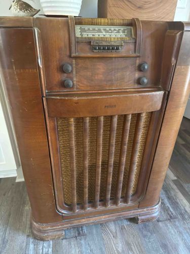 This is a vintage 1940s-era Philco floor console radio, likely a model from the early 1940s (circa 1941-1942). The unit features a substantial Art Deco-inspired wooden cabinet with rounded 'waterfall' style shoulders and edges. The exterior is constructed from walnut or mahogany veneers with a darker tonal finish. The upper section contains a horizontal glass multi-band dial, five mechanical push-button presets, and four bakelite control knobs. Below the control panel, a horizontal wooden trim piece displays the 'PHILCO' brand name in a block-letter stamp. The lower half features a distinctive vertical wooden slat 'louvre' grille over a patterned gold or tan fabric speaker cloth. In terms of condition, the item shows significant honest wear characteristic of its age. There is visible scuffing, finish loss, and chipped veneer along the bottom base and side edges. The top surface shows circular water stains and scratches. The grain of the wood is prominent, showing a nice aged patina, though the original lacquer appears dried and crackled in several areas. The mechanical components (tubes and wiring) are not visible but the physical completeness of the exterior suggests it has not been gutted for repurposing.