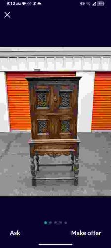 This is a Jacobean Revival style court cupboard, likely dating from the early to mid-20th century. The piece is constructed primarily of oak with a dark English finish. The upper section features a recessed cabinet with four distinct panels, each showcasing intricate relief carvings of foliate or floral motifs, characteristic of the 17th-century aesthetic. A central pull handle is visible on the upper door. The lower section consists of a deep drawer supported by heavy, bulbous 'cup-and-cover' turned legs, typical of the Jacobean period. These legs are connected by a sturdy H-stretcher for structural stability. A decorative scalloped apron sits below the drawer. Regarding condition, the piece shows significant surface patina and some darkening, especially toward the top, which may be intentional or due to age and dust accumulation. There appear to be minor scuffs and wear consistent with age, particularly along the base and edges. The craftsmanship indicates a mass-market revival piece designed to emulate the heavy, ornate furniture of the early 17th century. No specific maker's marks are visible in the provided image, but the overall geometry and proportions suggest a 1920s-1940s production era.
