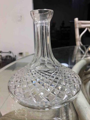 This is a classic 'Ships Decanter' crafted from high-quality clear cut crystal, characterized by its distinct wide, weighted base designed for stability on a moving vessel. The piece features a tall, slender neck with vertical flat-cut fluting that leads to a slightly flared, smooth polished rim. The broad, conical body is decorated with an intricate deep-cut diamond or 'cross-hatch' pattern that wraps around the shoulder and base, which serves to refract light brilliantly. The transitions between the smooth neck and the textured body show precise craftsmanship typical of mid-to-late 20th-century glassware, possibly from a manufacturer like Waterford or Marquis. The crystal appears thick and heavy, indicating a high lead content. Currently, the decanter is missing its original matching crystal stopper, which significantly impacts its functional use and market value. The glass appears to be in good condition with high clarity, showing no immediately visible chips or large scratches, though minor shelf wear on the bottom surface is expected for its age. The style is traditional and elegant, reflecting late Georgian or Victorian revival aesthetics popularized in the 1970s and 1980s.