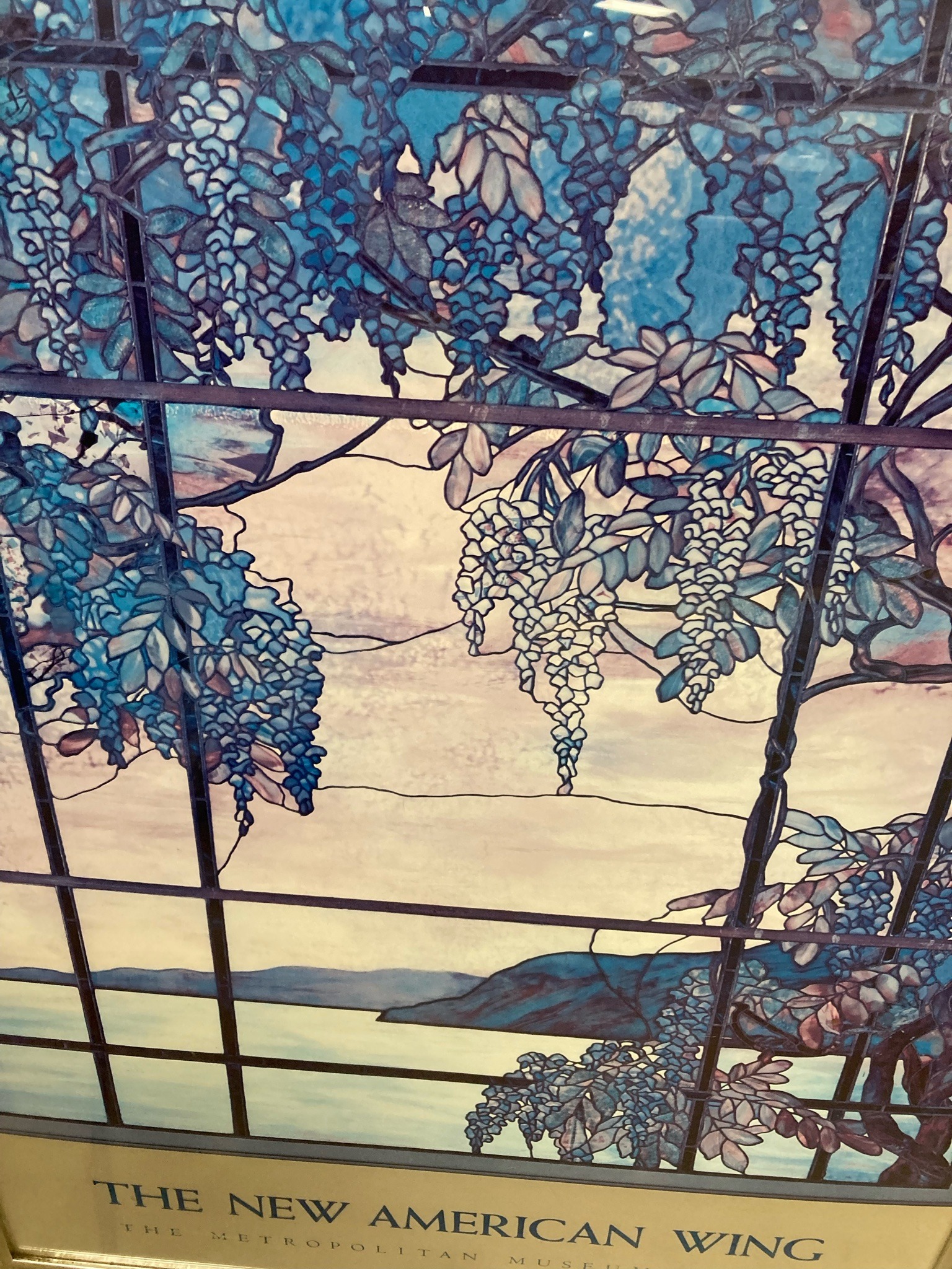 This item is a framed commemorative art poster featuring the iconic 'Wisteria' stained-glass landscape window originally designed by Louis Comfort Tiffany (American, 1848–1933) for his estate, Laurelton Hall. The image showcases the intricate Art Nouveau style, characterized by draping clusters of blue and violet wisteria blossoms against a panoramic landscape of distant hills and water. The composition is executed in a rich palette of cerulean, periwinkle, and pale lavender, with dark, heavy lead-line silhouettes separating the glass sections. The materials appear to be high-quality printed paper mounted under a protective transparent layer, likely glass or acrylic, within a metallic gold-toned frame. At the base, the poster bears the inscription 'THE NEW AMERICAN WING' and 'THE METROPOLITAN MUSEUM OF ART', indicating it was produced to celebrate the inauguration or expansion of that department. The condition appears excellent with no visible fading, moisture damage, or tears to the print. The framing is modern, and the overall craftsmanship of the print captures the nuanced textures of the original opalescent glass. This piece was likely produced in the late 20th or early 21st century as a high-end museum-shop offering.
