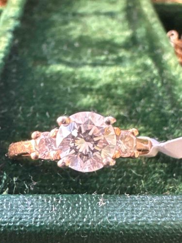 This is a classic three-stone 'trilogy' style ring, featuring a prominent central round brilliant-cut stone flanked by two smaller round brilliant-cut side stones. The center stone is held by four stout, rounded prongs, while the side stones appear to be secured by three to four prongs each in a graduated arrangement. The band or shank is crafted from yellow gold, which shows a warm metallic luster. Based on the visual size of the center stone relative to the prongs, it appears to be approximately 0.75 to 1.00 carat, though an exact measurement would require specialized tools. The stones exhibit a high degree of brilliance and light dispersion, suggesting diamonds or a high-quality stimulant such as cubic zirconia or moissanite. The setting is elevated to allow light entry from beneath the stones. The gold band shows some minor surface abrasions consistent with gentle wear, but the overall structural integrity seems sound. The stones appear clear to the naked eye with no large visible occlusions. This design is representative of modern jewelry styles common from the late 20th century to the present day. The craftsmanship appears clean and professional, with symmetrical prong placement and a polished finish on the yellow gold mounting.