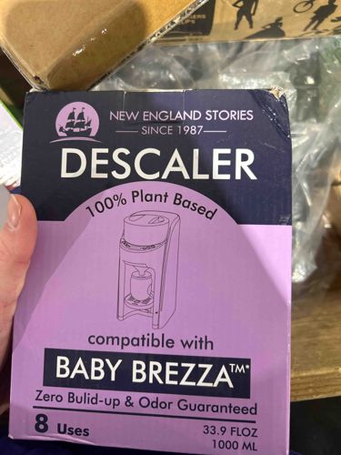 This item is a 33.9 fl oz (1000 ml) package of liquid descaling agent from the brand 'New England Stories', a company established in 1987. The product is marketed as a 100% plant-based solution, specifically formulated to be compatible with Baby Brezza machines, as indicated by the prominent branding and the line drawing of a formula maker on the front panel. The packaging features a distinctive color palette of deep navy blue and light purple, intended for household cleaning and appliance maintenance. The text promises 'Zero Build-up & Odor' and specifies that the bottle contains enough solution for 8 uses. Physically, the cardboard box shows minor wear and tear, notably a small crush and slight delamination at the top right corner, likely due to handling or shipping. There is a clear adhesive tape bridge at the top center, suggesting it may have been previously opened or reinforced. The typography uses a mix of serif for the brand name and clean sans-serif for the product functionality. The craftsmanship of the packaging is standard for modern consumer goods, focusing on clear informative graphics and manufacturer seals for authenticity.