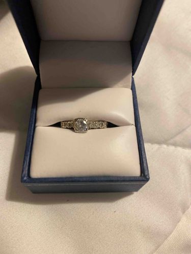 This item is an engagement-style ring crafted from a white precious metal, likely 14k or 18k white gold or platinum, presented in a blue textured jewelry box with a white faux-leather interior. The center stone is a round brilliant cut diamond or high-quality stimulant, approximately 0.50 to 0.75 carats, secured in a four-prong setting with a slightly squared gallery profile. The band features a pavé or channel-set arrangement of smaller round diamonds that extend halfway down the shoulders of the shank, enhancing the overall brilliance of the piece. The metal exhibits a high-polish finish with no immediate signs of heavy tarnishing, though minor surface scratches typical of light wear may be present upon closer inspection. The setting style suggests a contemporary or modern classic design, likely produced within the last 10-20 years. The craftsmanship appears consistent with mid-to-high-tier bridal jewelry, characterized by symmetrical stone placement and a balanced proportions. No visible maker's marks or hallmarks are identifiable from the upright position, but they would typically be found on the inner circumference of the shank.