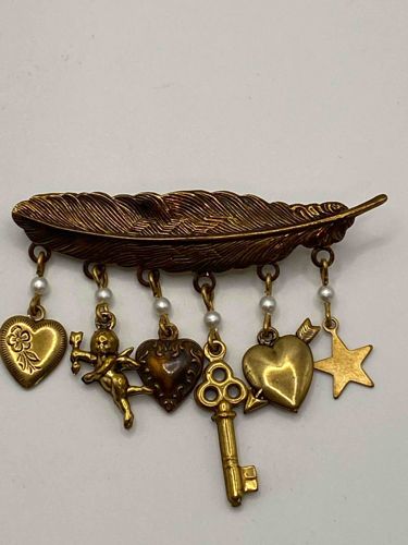 Vintage Gold-Tone Feather Brooch with Sentimental Charms