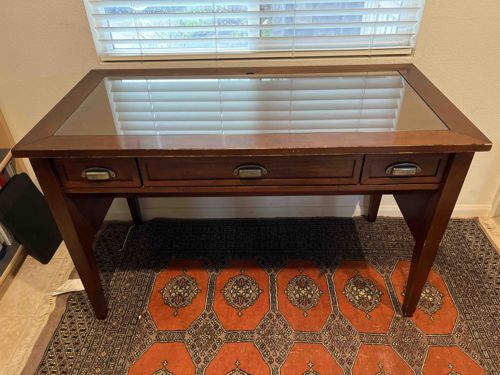 This is a rectangular writing desk featuring a rich brunette-stained wood frame, possibly cherry or walnut-finished hardwood, topped with an inset tempered glass work surface. The design incorporates elements of the Campaign and Industrial styles, evidenced by the clean lines and the aesthetic of the hardware. The desk houses three drawers: a large central drawer flanked by two smaller side drawers, each equipped with antiqued metal bin pulls or 'apothecary' style handles. The legs are tapered and rectangular in profile, connected to the apron with recessed side panels for structural stability. A notable feature is a cable management port or grommet visible at the rear of the glass top, suggesting a late 20th or early 21st-century manufacture intended for modern office use. Regarding condition, the front edge of the wooden desktop frame shows visible signs of wear, including several small nicks, scratches, and finish loss along the leading edge. The hardware exhibits a deliberate aged patina. The construction appears to be machine-made with mitered corners on the top frame, indicating a mass-market contemporary piece rather than a bespoke antique. Despite the surface wear on the finish, the desk maintains a sturdy appearance and functional design suitable for a home office environment.