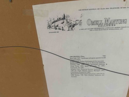 This item is an original artist provenance and biographical label attached to the reverse of a framed artwork. The label is printed on off-white paper and features the letterhead of 'Omell Manyung Galleries,' formerly located on Nepean Highway in Mt. Eliza, Victoria. The header includes an illustrative sketch of the gallery building and confirms the gallery was established in 1968. The text provides a detailed biography for the artist Theo Delgrosso, noting he was born in Italy in 1947 and is a landscape and genre painter. It lists his artistic education under Robert Hollingworth, significant exhibitions in the early 1980s (at Balmoral, Avenwinel, and Serpentine Galleries), and various awards such as the Colac Historical Society Landscape award. The label is secured to a brown fiberboard or Masonite backing with aged adhesive tape, and a thin black picture hanging wire crosses the foreground. The paper shows age-related yellowing (toning), minor staining, and creasing, particularly along the edges where it meets the backing board. This document serves as significant provenance for an Australian fine art piece from the late 20th century.