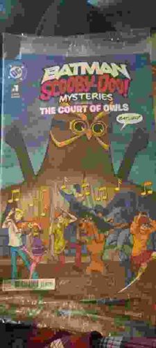 This is a single-issue comic book from DC Comics featuring a crossover between Batman and the Scooby-Doo Mystery Inc. gang. The cover art displays a giant, stylized owl figure towering over the main characters, explicitly referencing 'The Court of Owls' storyline. The Mystery Machine crew (Fred, Daphne, Shaggy, Scooby-Doo, and Velma) are depicted in the foreground in their classic character designs from the 2021 series. The issue is identified as number one of the series. The physical composition is a standard American comic book format, approximately 10.2 x 6.6 inches, printed on glossy paper with saddle-stitched binding. The color palette is vibrant, utilizing a mix of dark blues and purples for the background to match the Batman aesthetic, contrasted with the bright iconic colors of the Scooby-Doo cast. Notable markings include the DC logo in the top left corner, the issue number, and a barcode located at the bottom left of the front cover. Based on the visual inspection, the item appears to be in an unbagged state, showing slight pixelation in the digital capture which may obscure fine surface details, but no major structural tears or stains are immediately apparent at this resolution. This comic represents a contemporary age collectible (Modern Age), first published around 2021, and is designed for an all-ages audience, blending the dark detective themes of Gotham with lighthearted mystery-solving. High-quality digital coloring and professional illustration line work are evident throughout the cover design.