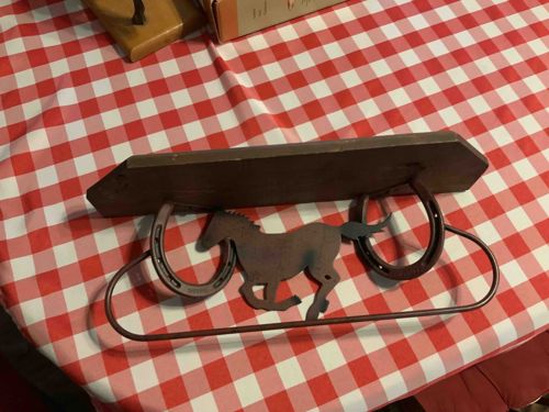 This is a wall-mounted decorative shelf featuring a rustic Western or equestrian theme. The piece is constructed with a solid wooden top plank, likely pine or a similar soft wood, which has been stained in a medium-to-dark walnut finish. The wooden shelf is supported by two authentic-style metal horseshoes that have been repurposed as structural brackets, welded to a lower metal framework. Centered between the horseshoes is a silhouette of a running horse cut from flat sheet metal, exhibiting a naturally weathered patina with hints of surface oxidation and dark coloration. A curved metal rail or bar extends outward and across the bottom, likely serving as a towel rack or decorative guard rail. The craftsmanship suggests a folk-art or 'hand-made' quality rather than mass production, common in late 20th-century rustic home decor. Condition-wise, the item shows moderate wear including light scuffs on the wood’s edges and a significant amount appealing patina on the metal elements consistent with age. There are no visible maker's marks, suggesting it may be a boutique artisan piece or a high-quality hobbyist project. The overall design aesthetic fits classic Americana or cabin-style interiors.