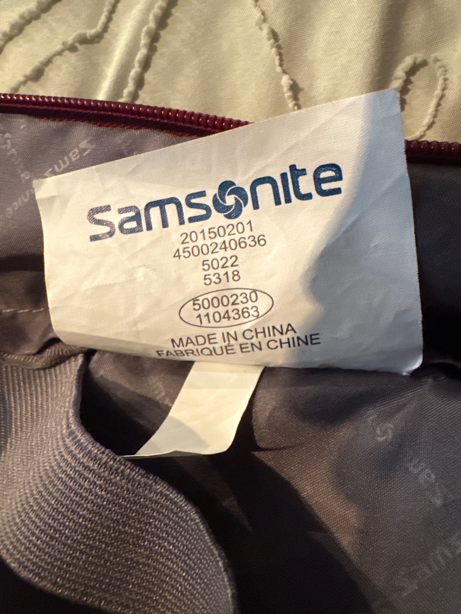 This item is an interior manufacturing and identification tag from a modern piece of Samsonite luggage. The tag is made of white synthetic fabric with black and blue printed text. It features the Samsonite logo in blue, followed by several rows of alphanumeric production codes: 20150201, 4500240636, 5022, 5318, and a circled pair of numbers 5000230 over 1104363. The bottom of the tag indicates it was 'MADE IN CHINA' with the French translation 'FABRIQUÉ EN CHINE' directly below. The tag is sewn into a gray, monogrammed lining featuring the 'Samsonite' logo in a repeating script pattern. Adjacent to the tag is a deep burgundy or plum-colored zipper track and a gray elastic strap, characteristic of modern softside suitcase interiors. The condition appears to be used but well-preserved with minor wrinkling and fraying on the tag edges. Based on the manufacturing style and information, this likely dates from the 2010s to the present. The codes serve as serial and batch identifiers for warranty and consumer tracking purposes.