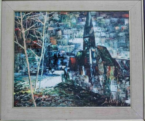 This is an original mixed media or oil painting on paper, characterized by a bold, modernist aesthetic with heavy palette knife application. The composition features an abstract architectural structure, possibly a cathedral or steepled village building, rendered in a palette of deep teals, slate grays, earthy browns, and punctuations of red. The background is constructed with rhythmic, block-like impasto strokes that suggest a stone wall or a dense urban atmosphere. To the left, delicate, skeletal white trees provide a linear contrast to the heavy textured buildings. The work is signed in the lower right corner, appearing to read 'A. Selvy' or similar, followed by the date '61', indicating it was produced in 1961. The painting is housed in a contemporary silver-toned wooden frame with a linen-textured inner liner and a thin metallic filet. While the paint surface appears stable with rich impasto peaks, there is visible minor discoloration or foxing on the linen liner. The paper substrate shows no immediate signs of buckling, though the dated nature of the piece suggests it belongs to the post-war European or American expressionist movement. The craftsmanship displays confident bravura and a keen sense of geometric abstraction typical of early 1960s gallery art.