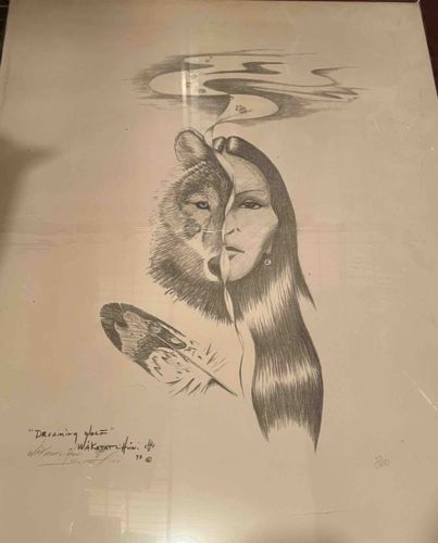 This is a monochrome charcoal or graphite illustration on white paper, titled 'Dreaming Wolf.' The artwork features a surrealist, split-portrait composition where one half of a face depicts a detailed wolf with textured fur, and the other half depicts a Native American woman with long, straight dark hair. A stylised wisp of smoke or spirit rises from the center of the head, culminating in an abstract cloud form at the top. Below the portraits, a decorative eagle feather is rendered with intricate shading. The piece is signed in the bottom left corner as 'Dreaming Wolf' by the artist 'Wakaya Griffin,' followed by a copyright symbol and the year '93' (1993). In the bottom right, there is a numbering '147/500,' indicating this is a limited edition print. The craftsmanship displays fine hatching and stippling techniques to create depth and shadow. Regarding condition, the paper appears slightly yellowed with age and shows visible horizontal and vertical creases, suggesting it may have been folded or improperly stored. There are also some minor surface scuffs and areas of uneven tonality on the paper substrate, likely due to light exposure or handling.