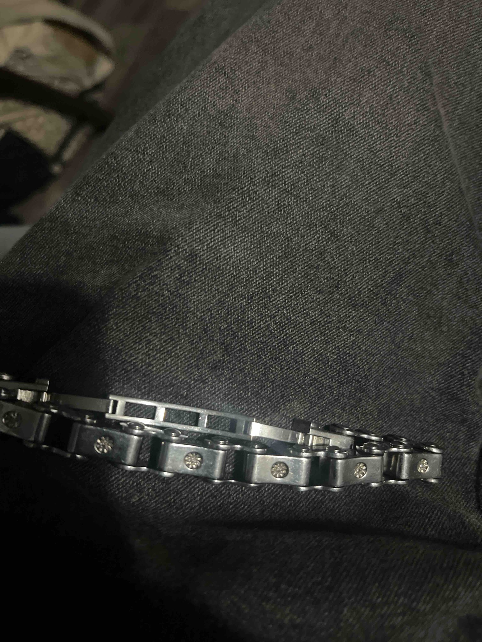 This contemporary men's accessory is a heavy-duty bracelet designed to replicate the mechanical structure of a bicycle or motorcycle drive chain. The piece is constructed from high-polish metallic links, likely stainless steel given the bright, cool-toned luster and lack of significant tarnish. Each rectangular link plate features a central indentation with an embossed starburst or floral-motif rivet head, which serves as a decorative focal point. The links are joined by cylindrical pins and inner rollers, providing a fluid motion similar to its industrial inspiration. The bracelet includes a fold-over clasp or a hidden snap-link mechanism for security. In terms of condition, the surfaces show minor superficial micro-scratches consistent with light use, but the structural integrity remain strong with no visible deformation of the pins. The craftsmanship is of retail-fashion grade, showcasing precise alignment and uniform polishing. This style gained popularity in the late 20th to early 21st century as part of the 'biker' or 'industrial' jewelry trend, appealing to those who value rugged, gear-oriented aesthetics.
