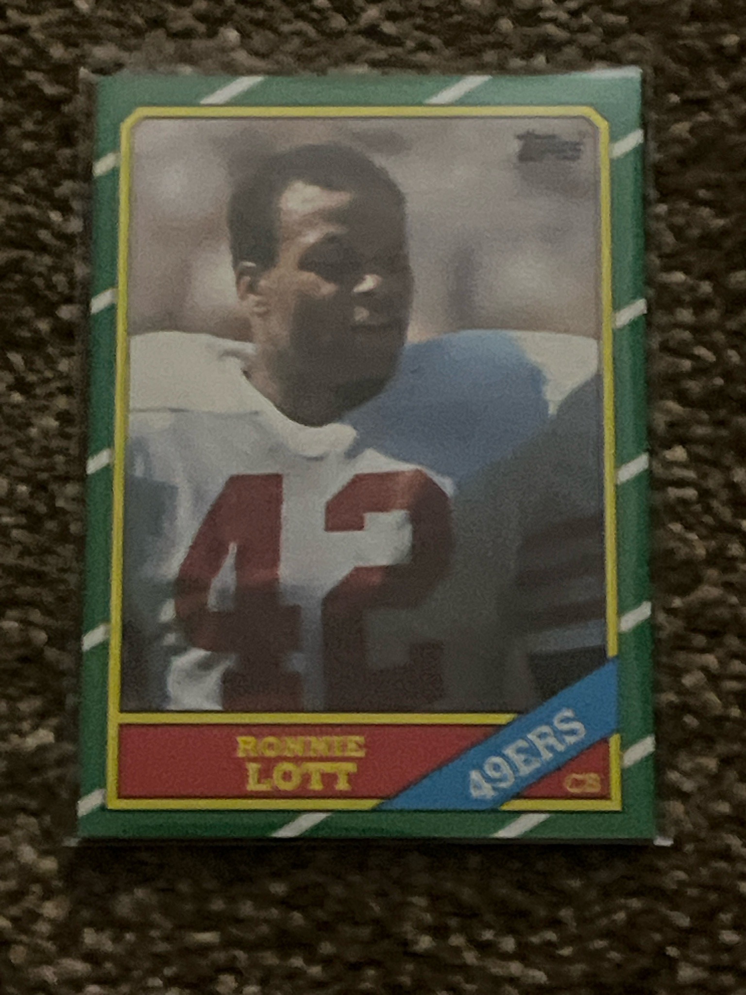 This is a vintage 1982 Topps football trading card featuring San Francisco 49ers defensive back Ronnie Lott. The card is printed on standard cardstock and measures approximately 2.5 by 3.5 inches. The design is characteristic of the 1982 Topps set, featuring a green border with diagonal white 'yard line' stripes and a yellow inner frame. The bottom section includes a red name bar with 'Ronnie Lott' in yellow lettering and a blue diagonal banner in the corner identifying his team as the '49ERS' with the 'CB' position noted. The central image is a portrait photograph of Lott in his white 49ers jersey, showing his number 42 prominently in red. The Topps brand logo is visible in the upper right corner of the photo area. Based on the visual evidence, the card appears to be housed in a clear protective sleeve. The centering seems slightly shifted toward the bottom and left edges. As a rookie card of a Hall of Fame player, this represents a significant piece of modern football history. The surface colors appear vibrant, though a full appraisal would require inspection of the reverse side and the card's physical corners for sharpness and edge wear.