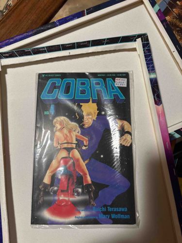 This is a physical copy of the comic book 'Cobra' issue number 2, published by Viz Select Comics. It features the work of renowned manga artist Buichi Terasawa with English adaptation by Marv Wolfman. This particular edition is likely from the early 1990s (circa 1990) during the initial English licensing of the Japanese Space Adventure Cobra series. The cover art displays vibrant, pulp-inspired science fiction illustrations including the protagonist Cobra and a female figure on a futuristic vehicle. The comic appears to be housed in a protective plastic polybag which shows significant light reflection and some surface warping. Notable physical features include the bold blue title 'COBRA', a price marking of $2.25 US at the top right, and the Viz Select logo at the top left. The condition shows some visible signs of handling, with minor spine stress lines and slight corner blunting visible through the plastic. The print quality reflects standard late 20th-century comic production with glossy cover stock and matte interior pages. No major creases, tears, or water damage are immediately apparent, though the underlying paper may show natural yellowing due to age. This issue is a key part of the first wave of manga translated for the Western market, representing a significant period of cross-cultural media exchange.