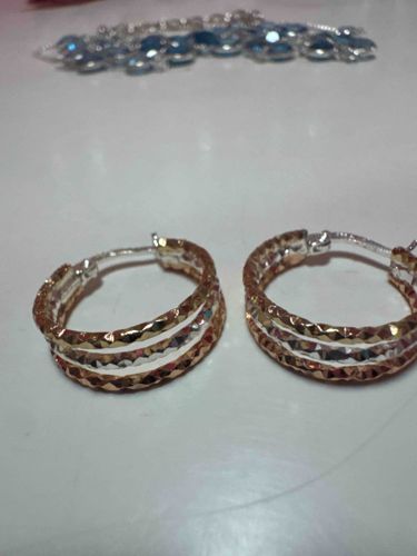 A pair of decorative hoop earrings featuring a tri-tone metallic appearance, consisting of rose gold, yellow gold, and silver-toned bands. Each earring is constructed with three distinct rounded bands fused together into a single hoop structure. The surface of each band features a high-relief 'diamond-cut' or faceted texture, intended to catch and reflect light for a shimmering effect. The earrings are equipped with a saddle-back or 'huger' style closure, utilizing a curved post that snaps into a notched catch on the opposite side of the hoop. The overall diameter appears to be approximately 15-20mm, categorizing them as small to medium hoops. In terms of material, the visible surface suggests either solid 10k/14k gold in various alloys or, more likely, gold-plated sterling silver (vermeil) or a base metal alloy. The interior of the hoops shows a lighter, silvery underside, which may indicate a plating wear or a specific manufacturing process. Condition appears to be fair to good; there are no immediate signs of structural breaks, though the metal surface shows minor scratches and potential oxidation typical of light use. No specific maker's marks or hallmarks are visible in the photograph, but the style is characteristic of contemporary mass-market fine or fashion jewelry produced within the last 20 years.
