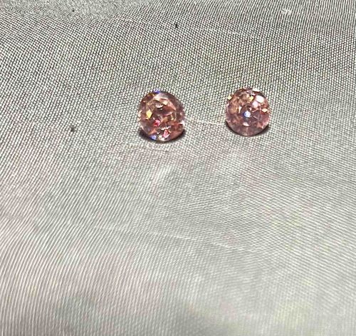 A pair of decorative stud earrings featuring a rounded, hemispherical design. Each earring is densely set with numerous light pink or rose-colored faceted crystals in a pavé or 'shamballa' style arrangement. The crystals exhibit a high degree of brilliance with multi-colored light dispersions known as 'fire,' which suggests they are likely high-quality lead crystal or cubic zirconia specifically cut to reflect light from multiple angles. The base material is not fully visible but appears to be a silver-toned metal or a resin-based clay in which the stones are embedded. The diameter of each stud is approximately 6mm to 8mm. The construction shows a uniform surface with minimal visible metal between the stones, indicative of modern costume jewelry manufacturing. The condition appears excellent with no visible missing stones or significant dulling of the facets. This style of earring emerged in the late 20th to early 21st century, often associated with a 'shamballa' aesthetic. The quality of the sparkle suggests a Swarovski-style crystal application, though no specific maker's mark is visible. They are lightweight and designed for daily wear or evening accessorizing.