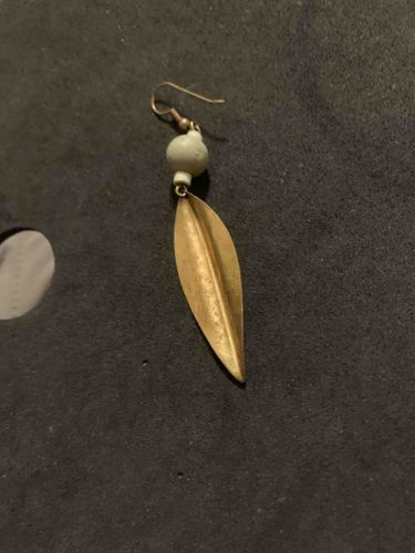 This is a single drop-style earring featuring a mixed-media construction of metal and ceramic components. The focal point is a slender, elongated leaf-shaped pendant crafted from a yellow-tone metal, likely brass or gold-plated base metal, with a pronounced central vein and a subtle matte, textured finish. Above the leaf sits a spherical, pale seafoam green or off-white ceramic bead that shows minor surface pitting and irregularities consistent with handmade artisanal work. The earring is suspended from a simple wire fishhook (shepherd's hook) ear wire. The overall aesthetic suggests a contemporary bohemian or nature-inspired style, likely dating from the late 20th to early 21st century. Condition-wise, the metal shows a significant aged patina with dark oxidation spots and localized tarnishing, particularly on the ear wire and the jump ring connector. No maker's marks or hallmarks are visible in the provided image. The construction quality is modest, suggesting a mass-produced boutique item or an individual craft piece rather than fine jewelry. The leaf measures approximately 1.5 to 2 inches in length.