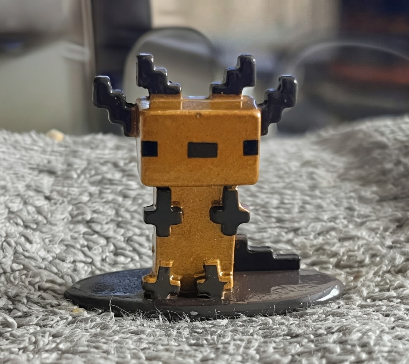 This is a small, die-cast metal figurine depicting the 'Gold' (or yellow/wild) variant of the axolotl creature from the popular video game Minecraft. The item stands approximately 1.5 to 2 inches tall and is constructed from a heavy metal alloy, giving it a substantial weight relative to its size. It features a high-gloss, metallic gold finish on the main body, while the characteristic external gills, pixelated eyes, mouth, and limbs are rendered in solid black. The aesthetic is strictly 'voxel-based' or 'pixelated,' mirroring the in-game art style with sharp 90-degree angles and blocky segments. The figure is permanently attached to a thin, black oval-shaped base for display stability. In terms of condition, the item appears largely intact, though there is visible surface wear including fine scratches, slight paint chipping on the corners of the head and tail, and some dust accumulation in the crevices, suggesting it has been handled or displayed out of its original packaging. These figures are typically produced by Jada Toys as part of their 'Nano Metalfigs' or similar die-cast Minecraft lines, likely dating from the early 2020s following the introduction of axolotls to the game in version 1.17. The craftsmanship is industrial-grade, designed for durability as both a collectible and a play-piece.