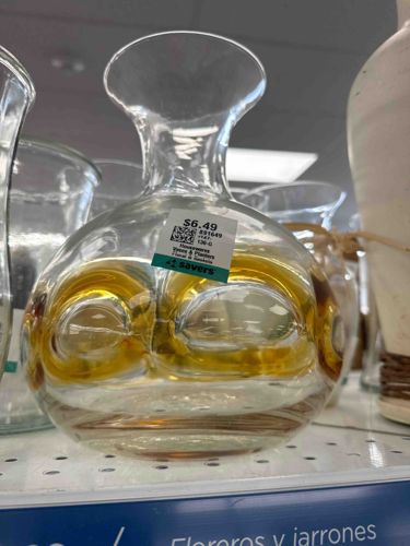 This is a hand-blown art glass vase featuring a distinct globular body that transitions into a flared, trumpet-shaped rim. The piece is crafted using clear glass with a striking amber or honey-colored internal inclusion that forms large, rhythmic 'bullicante' or 'thumbprint' indentations around the center. These indentations create a lens-like optical effect, characteristic of Mid-Century Modern glass design. The base appears to be thick and weighted, a sign of high-quality craftsmanship, providing stability to its rounded form. In terms of construction, the smooth transition from the narrow neck to the wide boca suggests a skillful glassblower. While no specific maker's mark is visible through the thrift store price tag ($6.49), the style is highly reminiscent of Italian Murano or Scandinavian glass from the 1960s or 1970s. The condition appears excellent with no visible chips or cracks, though typical shelf wear on the bottom surface and light surface dust are present. The amber hue within the clear casing shows a warm, consistent saturation without clouding, suggesting well-maintained material integrity. The piece measures approximately 6 to 8 inches in height, fitting the profile of a decorative accent or a small floral vessel.