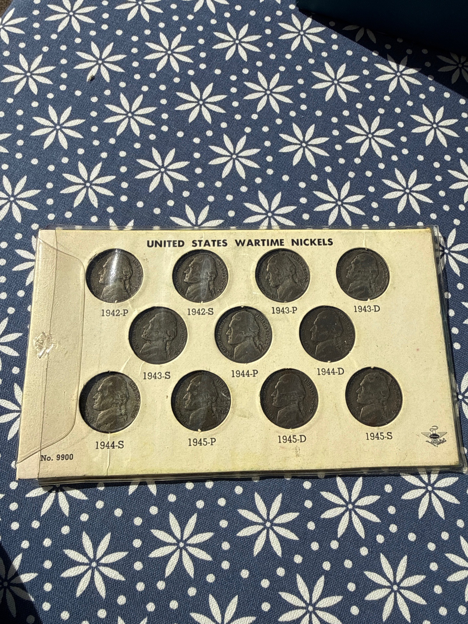 This is a comprehensive 11-coin set of United States 'Wartime' Jefferson Nickels, produced between the mid-1942 and 1945. These specific coins are composed of a unique alloy—35% silver, 56% copper, and 9% manganese—rather than the standard copper-nickel mix, necessitated by the prioritization of nickel for military use during World War II. The collection is housed in a vintage cream-colored cardboard holder (No. 9900) protected by a plastic sleeve. The set includes every year and mint mark combination from the wartime era: 1942-P, 1942-S, 1943-P, 1943-D, 1943-S, 1944-P, 1944-D, 1944-S, 1945-P, 1945-D, and 1945-S. Visually, the coins exhibit the classic deep charcoal grey to black patina characteristic of high-silver-content wartime nickels when exposed to circulation and certain storage environments. Most coins show moderate circulation wear with softened details on Jefferson's portrait. A defining feature of these coins is the oversized mint mark (P, D, or S) positioned above the dome of Monticello on the reverse, marking the first time the 'P' mint mark was used on a U.S. coin. The cardboard holder shows minor shelf wear, light creases on the left flap, and slight yellowing consistent with age, but the printed labels remain clear and legible.