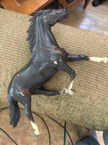 This item is a vintage model horse figurine, identified as the 'Rearing Stallion' mold produced by the Breyer Molding Company (Breyer Animal Creations). The horse is depicted in an energetic rearing pose, captured at the peak of its movement. It is constructed from a hard cellulose acetate plastic, common for Breyer models of the mid-to-late 20th century. The coloration is a dark seal bay or charcoal brown with subtle mahogany undertones visible along the muscular definition of the shoulders and flanks. It features white 'sock' markings on its front right and rear right legs, with light-colored hooves. The mane and tail are deeply textured, showing individually sculpted hair strands, and the head is detailed with a molded-on halter with metallic gold-painted rings. Regarding condition, this specimen shows significant evidence of play wear and age. There are several prominent white scuffs and paint loss areas, most notably on the right shoulder and the right hip area, where the underlying white plastic is visible. The original semi-gloss finish has become dull in several spots, and the white paint on the legs shows some discoloration or 'yellowing.' There are no immediate visible breaks or structural repairs, though 'ear tip' or 'hoof' rubs are common for this specific mold and likely present. Based on the molded halter style and color scheme, this piece likely dates from the late 1960s to the 1980s. While not in mint collector condition, it represents a classic examples of early American mass-market equestrian modeling and captures the anatomical realism Breyer is known for.