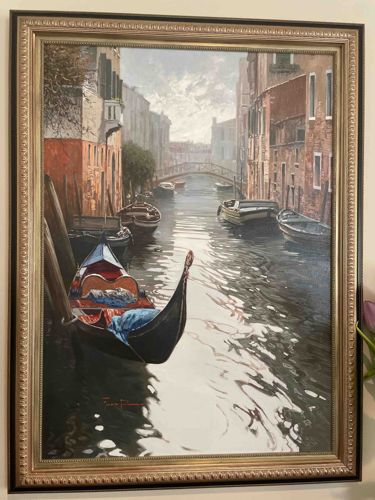 This is a contemporary representational oil or acrylic painting on canvas depicting a classic Venetian canal scene. The composition features a prominent black gondola moored in the lower-left foreground, detailed with red interior upholstery and blue fabric accents. The perspective leads the viewer's eye down a receding waterway flanked by historic brick and plaster buildings in earthy tones of terracotta, ochre, and grey. In the distance, a stone footbridge spans the canal under a bright, overcast sky. The artist employs a soft-focus or impressionistic technique in the background, contrasting with the sharper, more detailed rendering of the foreground water reflections and the gondola. A signature in red script is visible in the lower left corner, though the specific artist is not immediately identifiable without further provenance. The painting is housed in a modern decorative frame consisting of a silvered or light gold-toned beaded inner fillet and a darker outer molding. The condition appears to be excellent with no visible craquelure, paint loss, or sagging to the canvas support. The frame shows minimal wear, indicating it is likely a late 20th to early 21st-century production intended for residential decoration. The craftsmanship shows a competent handle on atmospheric perspective and the play of light on water surfaces, typical of high-quality commercial gallery art.
