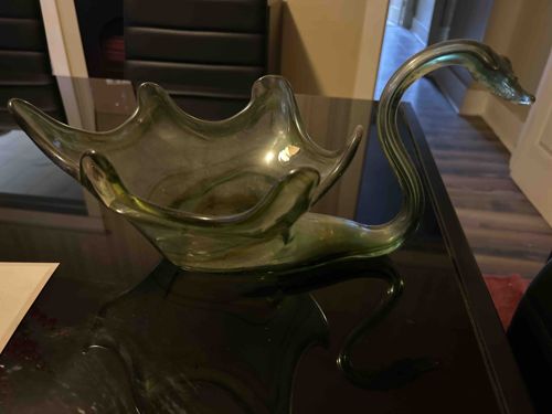 This item is a decorative art glass centerpiece bowl formed in the stylized shape of a swan. The piece is constructed from thick, hand-stretched glass, characteristic of the mid-20th-century art glass movement. It features a translucent moss green or olive green tint that shifts in saturation throughout the body. The design includes a long, elegantly arched neck ending in a simplified head and beak, while the body flares out into a wide, ruffled, or 'free-form' bowl that suggests wings and tail feathers. The glass shows internal striations and small air bubbles (seeds), indicative of hand-blown production rather than machine pressing. The base appears to be thick and polished, though no specific maker's mark is visible in this view. The style is highly reminiscent of Murano (Venetian) glass from the 1950s or 1960s, or perhaps Sooner or Chalet glass. The condition appears fair to good; there is visible sediment or cloudiness in the bottom of the bowl, likely from hard water deposits or long-term stagnant water use as a planter. There are no obvious cracks or large chips visible on the neck or rim, which are the most vulnerable areas for this type of glassware.