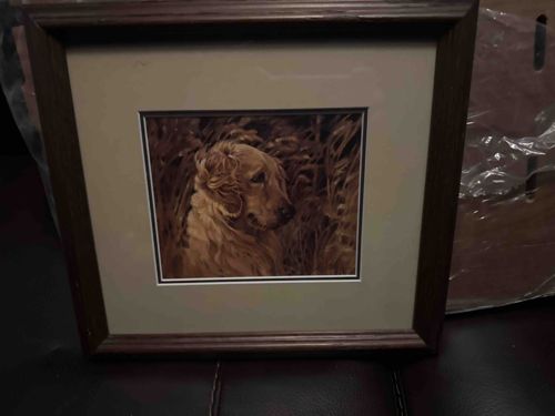 This item is a framed and matted artistic print featuring the head of a Golden Retriever dog, rendered in a realistic, painterly style. The composition uses a sepia-toned or warm ochre palette, depicting the dog against a textured background of tall grass or reeds. The artwork is presented within a double-matting system: an inner dark border (likely a deep brown or black) and a wider outer mat in an off-white or light cream shade. It is housed in a square, dark wood frame with a visible grain and a traditional beveled profile. The frame's construction appears to be machine-milled with standard mitered corners. Regarding condition, the frame exhibits minor surface scuffing and small nicks along the edges, consistent with household use. The matting appears clean without visible water damage or foxing. There are no readily apparent maker's marks or artist signatures visible in the photograph, suggesting it is a commercial decorative print, likely produced in the late 20th or early 21st century. The level of detail in the dog's fur suggests a quality reproduction of an original oil painting or high-detail sketch.