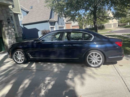 This is a 2016 BMW 7 Series full-size luxury sedan, finished in a deep metallic navy blue, likely Carbon Black Metallic or Imperial Blue Brilliant Effect. This specific model belongs to the G11 (standard) or G12 (long-wheelbase) generation, which debuted for the 2016 model year. The vehicle features a sleek profile with prominent chrome detailing, including the window surrounds, rocker panel accent strip, and functional 'air breather' vents behind the front wheels. It is equipped with multi-spoke alloy wheels featuring the signature BMW hubcaps. The bodywork displays modern engineering with a focus on 'Carbon Core' construction, utilizing carbon-fiber-reinforced plastic for lightweight strength. The exterior paint appears to be in well-maintained condition with a high-gloss finish, though minor surface dust and typical road grime are visible on the lower panels. There is some slight sun glinting off the rear quarter panel, showing the metallic flake in the paint. No significant dents, scratches, or structural repairs are immediately visible from this side profile. The chrome trim retains its brightness without obvious oxidation. As a flagship luxury vehicle, it exemplifies premium German craftsmanship with tight panel gaps and high-quality materials throughout the exterior assembly.