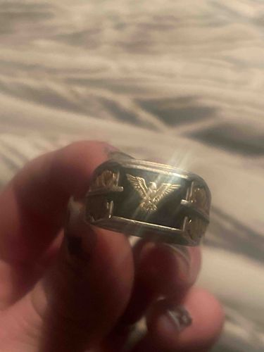 This is a men's signet-style ring featuring a two-tone metallic design. The primary band appears to be constructed from a high-polished white metal, likely sterling silver or a durable stainless steel, given its cool luster. The rectangular face of the ring contains a recessed black enamel or onyx-like inlay, which serves as a backdrop for a prominently centered gold-toned eagle with outstretched wings. The eagle is rendered in a heraldic or patriotic style, typical of mid-to-late 20th-century masculined jewelry design. Flanking the central emblem on the shoulders of the ring are additional gold-toned decorative accents, possibly representing laurel leaves or architectural scrolls, suggesting a theme of strength or military service. The construction shows a cast base with applied decorative elements. Regarding condition, the metal surfaces exhibit minor surface abrasions and micro-scratching indicative of regular wear, though no significant structural deformations or deep gouges are visible. The gold plating or inlay shows moderate thinning on high-relief areas, which is common for vintage costume or plated jewelry. There are no visible maker's marks on the exterior; interior hallmarks (if any) are not visible in the provided image. The style is consistent with 1970s-1990s men's fashion accessories, prioritizing bold, symbolic motifs and high-contrast color palettes.