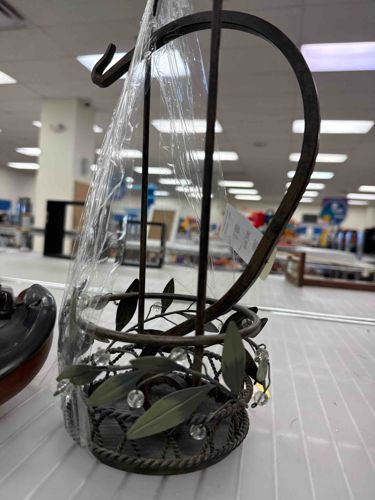 This item is a decorative hanging candle holder or lantern frame, likely designed to hold a thick pillar candle. It is constructed from dark, oil-rubbed bronze finished wrought iron or similar heavy metal. The structure features a circular basket base adorned with a double-twisted metal wire rim and a lattice-style bottom. A distinctive 'C' shaped handle or hook extends from the back of the base to facilitate hanging. The base is further embellished with sage-green metal leaves and clear acrylic or glass faceted beads that mimic the appearance of crystal droplets or berries. In terms of condition, the item appears to be in good used condition with no visible structural damage, though it is currently partially wrapped in protective plastic film and has a white adhesive price tag attached to the frame. The style is contemporary with a rustic, nature-inspired aesthetic, likely manufactured in the late 20th to early 21st century. The craftsmanship is of a standard commercial quality, consistent with homeware found in specialty retail stores. It measures approximately 12-14 inches in height.