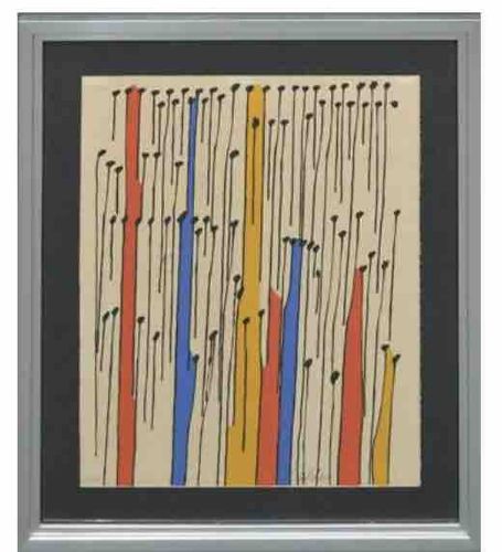 This item is an abstract lithograph by the renowned American artist Alexander Calder (1898-1976), titled 'The Drip.' The artwork features a modernist composition characterized by vertical, primary-colored bars in red, blue, and yellow set against an off-white or cream-colored paper background. Superimposed over these thick bands are numerous thin, black vertical lines ending in rounded 'drip' or 'blob' shapes, creating a sense of gravity and fluid motion. The piece is hand-signed by the artist in the lower right corner, which is a significant indicator of many authentic Calder lithographs from the mid-20th century, specifically the late 1960s to 1970s. The artwork is professionally framed within a silver-toned metallic or painted wood frame, accented by a wide black mat that provides a stark contrast and draws the viewer's eye toward the vibrant colors of the print. The condition appears to be excellent with no visible foxing, tearing, or discoloration of the paper substrate, though it remains under glass. The colors retain high saturation, suggesting minimal light damage. The style is quintessentially Mid-Century Modern, reflecting Calder's mastery of simple forms and bold color palettes also seen in his famous mobiles. The craftsmanship is evident in the precise registration of the lithographic ink layers and the balanced weight of the composition.