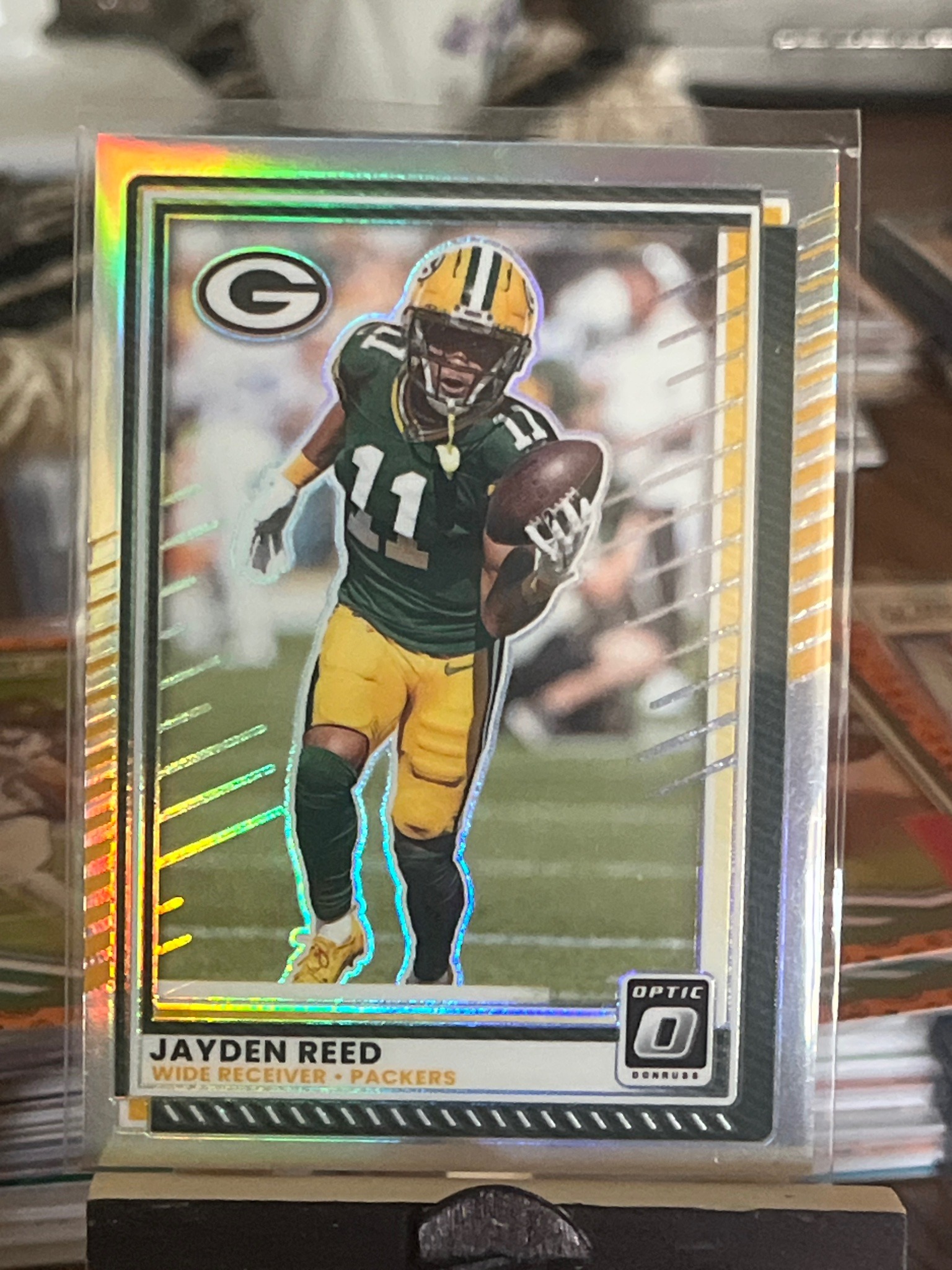 This is a 2023 Panini Donruss Optic trading card featuring Green Bay Packers wide receiver Jayden Reed. The card is a 'Silver Holo' Prizm parallel, characterized by its high-gloss, reflective chromium finish that produces a rainbow-like spectrum effect when caught by light. The front of the card features a centered action shot of Jayden Reed in full uniform (jersey number 11) running with the football. In the top-left corner, the iconic green and gold 'G' Packers logo is visible. The bottom section contains the player's name, 'JAYDEN REED', and his position/team, 'WIDE RECEIVER • PACKERS'. The Donruss 'Optic' brand logo is located at the bottom right. The card is housed within a protective clear plastic penny sleeve and top-loader, suggesting it is well-maintained and kept in a collector-grade condition. The centering appears well-balanced from left to right, and the corners, visible through the sleeve, appear sharp. This modern sports card is manufactured by Panini America and represents Reed's rookie year, making it a desirable item for sports memorabilia collectors and fans of the franchise.