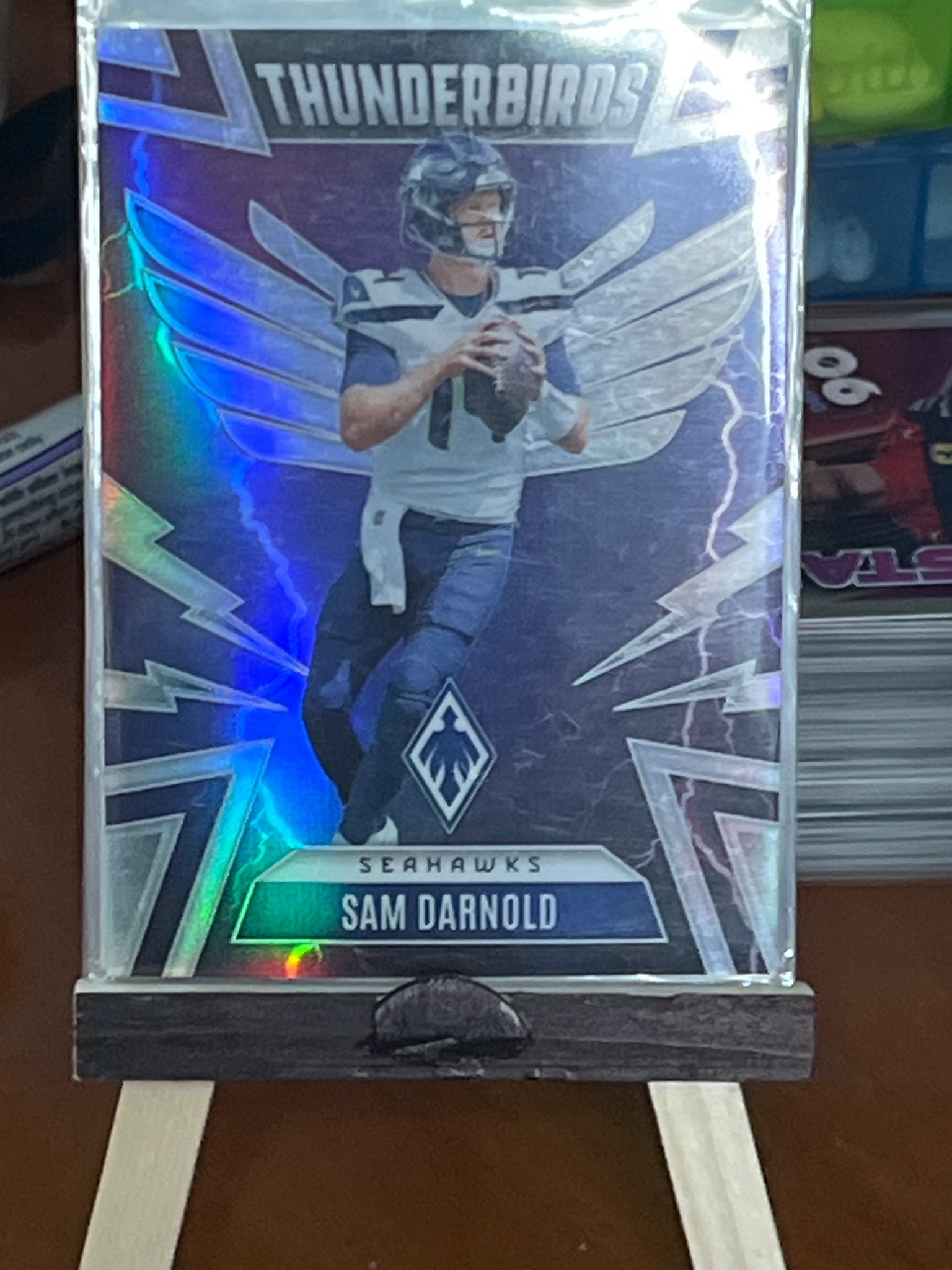 This is a modern collectible sports card featuring NFL quarterback Sam Darnold. The card is part of the 'Thunderbirds' insert set from the Panini Phoenix football card line. Structurally, the card is standard 2.5 by 3.5 inches, constructed from thick premium cardstock with a high-gloss, refractive metallic finish. The design features a stylized image of the player in a Seattle Seahawks uniform, set against a dynamic purple background with silver lightning bolts and refractive wing-like elements that produce a rainbow-colored 'prizm' effect when moved under light. The card includes the team name 'Seahawks' and player name 'Sam Darnold' at the bottom, with the 'Thunderbirds' wordmark at the top. The Phoenix brand logo is prominently displayed as a diamond-shaped emblem near the bottom center. Regarding condition, the card is currently housed in a protective soft plastic sleeve (penny sleeve) and appears to be in Excellent to Near-Mint condition. The centering looks slightly heavy towards the right border. Surface-wise, the refractive coating is vibrant with no immediate signs of deep scratching or gouging visible through the sleeve. The corners appear sharp from this perspective, and the edges seem clean without significant white chipping. This card represents a modern 'short-print' or 'insert' style common in the hobby since the late 2010s, appealing to both player fans and set collectors seeking shimmering parallel versions.