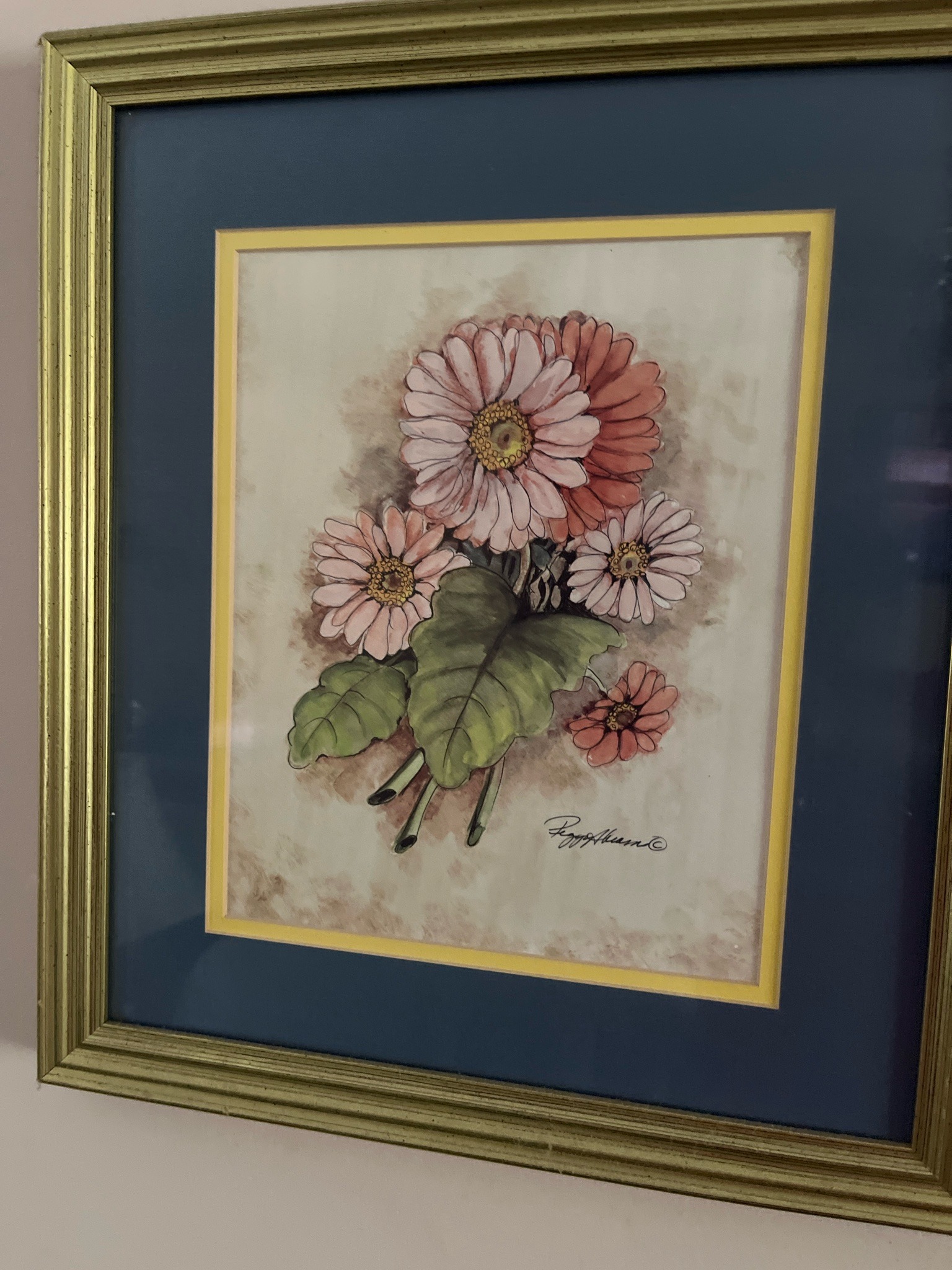 This is a framed decorative art print featuring a bouquet of Gerber daisies, rendered in a watercolor and ink style by artist Peggy Abrams. The composition displays a central larger blossom in pale pink and white, flanked by darker coral and mauve flowers, supported by large green leaves. The artwork is signed 'Peggy Abrams' with a copyright symbol in the lower right. Physically, the piece is presented in a double-matted format, featuring a light yellow inner mat and a deep navy blue outer mat, which provides a high-contrast decorative border. The frame is a gold-toned metallic or wood-imitation molding with a classic fluted or reeded texture and a soft patina. The overall style is reminiscent of late 20th-century floral decor, likely from the 1980s or 1990s. The craftsmanship of the framing appears professional, with the mats precisely cut. Condition appears good with no visible foxing, fading, or moisture damage to the paper, though the frame shows some minor surface dust and light age-related wear on the corners. This type of botanical art was popular for residential interior design, characterized by soft pastels and delicate linework.