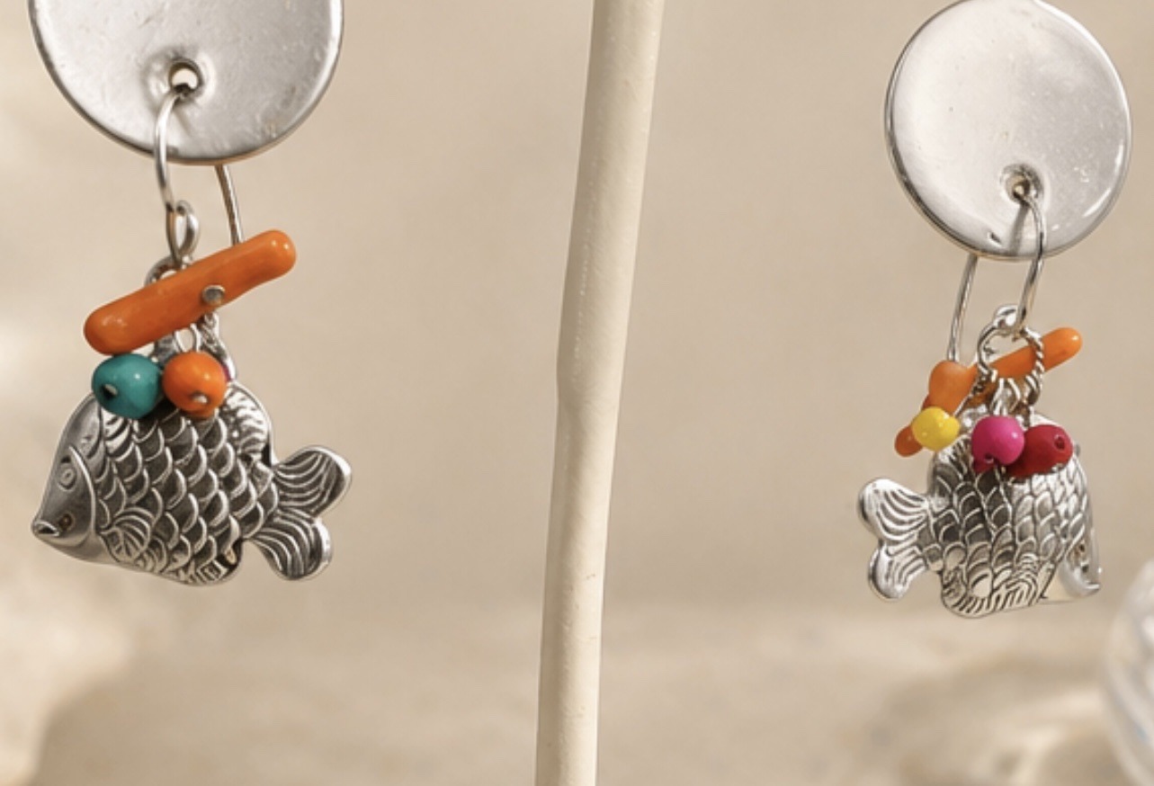 Artisanal Bali Silver Fish Charm Earrings with Multi-Color Wood Beads