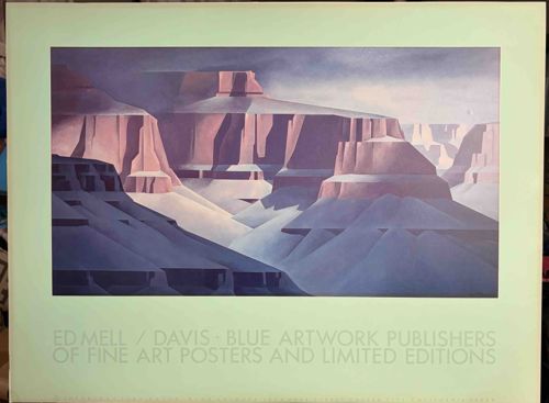 This is a vintage fine art exhibition poster featuring a stylized Southwest canyon landscape by the renowned American artist Ed Mell. The piece is printed on a heavy-weight, matte-finish paper stock with a wide decorative margin in a pale mint green or sage hue. The central image showcases Mell’s signature 'Arizona Modernist' style, characterized by geometric, angular rock formations and a dramatic use of light and shadow. The color palette within the painting is sophisticated, utilizing deep purples, dusty rose, cool blues, and soft whites to depict the atmospheric perspective of a desert canyon. Below the image, block text in a light-colored sans-serif typeface reads 'ED MELL / DAVIS • BLUE ARTWORK PUBLISHERS OF FINE ART POSTERS AND LIMITED EDITIONS'. The construction suggests a high-quality offset lithographic process typical of art publishers in the 1980s and 1990s. The overall condition appears excellent with crisp edges and vibrant pigments, showing no immediate signs of significant foxing, creasing, or sun-fading. The bottom edge contains smaller copyright and publisher information, confirming its status as an authentic Davis Blue Artwork production. The craftsmanship is evident in the precise registration and high-fidelity reproduction of Mell’s original brushwork, making it a desirable piece for collectors of Southwest art and mid-century modern aesthetic revivals.
