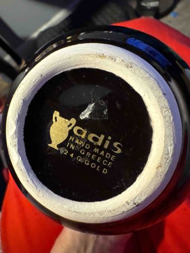 This item is a handcrafted ceramic vessel, likely a vase or decorative pot, produced by the Greek manufacturer 'Adis'. The item features a high-gloss black glaze on its primary exterior and interior surfaces. Its most prominent feature is the gold leaf or gold paint detailing, which the maker's mark indicates is 24-karat gold. The base of the piece is circular with a thick, unglazed white ceramic foot rim, showing the natural light-colored clay body. The central recessed portion of the underside contains a clear gold-foil backstamp featuring a graphic of an amphora and the text 'adis HAND MADE IN GREECE 24.G GOLD'. The style is a mid-to-late 20th-century interpretation of classical Greek pottery, often sold as high-quality decorative souvenir ware. In terms of condition, there is a visible adhesive residue or sticker fragment near the center of the base, and the unglazed foot rim shows minor gray scuffing and shelf wear. The black glaze appears well-maintained with a strong reflective lustre. This piece represents typical boutique Greek craftsmanship from the modern era, focusing on the contrast between luxury metallic finishes and traditional dark glazes.