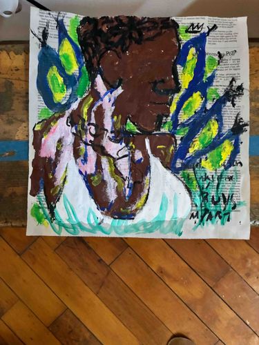 This original mixed media painting on a newsprint substrate is a significant work from Courtney Jolliff's 'Service' exhibition in Detroit. The piece features a stylized portrait of an individual in profile, rendered with thick, expressive applications of paint that suggest an impasto technique. The subject is depicted with dark brown skin tones, wearing a white garment, and is framed by vibrant, abstract wing-like forms in neon green, yellow, and deep blue. The use of a newspaper or typed manuscript page as the canvas provides a textured, intellectual backdrop that contrasts with the raw, neo-expressionist style of the figure. Notable markings include a crown motif in the upper right corner, a signature element of the artist, along with the handwritten text 'MY ART' and 'BOYS' near the bottom right. The condition appears consistent with contemporary works on paper produced in a non-traditional studio setting; the edges of the newsprint are slightly irregular and the paper shows minor undulating from the moisture of the paint. Created circa 2023-2024, the work is a poignant reflection of the artist's personal history following a 2022 house fire, celebrating the human connections that sustained him through homelessness. The craftsmanship is characterized by bold, gestural brushstrokes and a vibrant color palette that conveys both emotional weight and resilience.