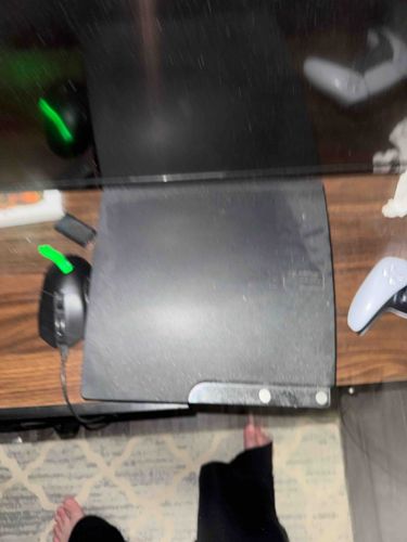 This item is a Sony PlayStation 3 (PS3) Slim model, which was released by Sony Computer Entertainment between 2009 and 2012. The console features a matte black charcoal finish on its plastic exterior, distinguishing it from the glossy 'piano black' finish of the original fat models. Physically, the Slim is significantly lighter and thinner than its predecessor. It features a curved, square-angled design with the 'PS3' logo embossed on the top surface. The front face includes a disc-loading slot and tactile power and eject buttons, unlike the touch-sensitive pads found on top-tier original models. The rear typically contains ports for HDMI, AV Multi Out, Digital Out (Optical), Ethernet, and a standard power inlet. Regarding condition, this specific unit appears to be in used, fair condition. There is a noticeable accumulation of dust and surface debris across the top and front panel, which is common for electronics of this era. The plastic shows some light surface scuffing and smudging, particularly near the control buttons. There do not appear to be any major structural cracks or deep gouges visible from this angle, though the environment suggests it is currently in an active, uncleaned state. The lack of visible original packaging and the presence of dust significantly impact its desirability for high-end collectors, though it remains a staple piece for retro gaming enthusiasts. This model is known for improved reliability, quieter operation, and lower power consumption compared to the launch versions of the console.