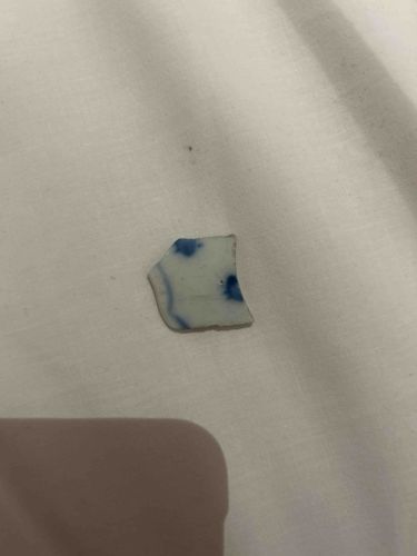 White and blue porcelain fragment found near Oshino Hakkai, Japan buried in the top of the soil. 2-3 cm in size on each side (square-like)
