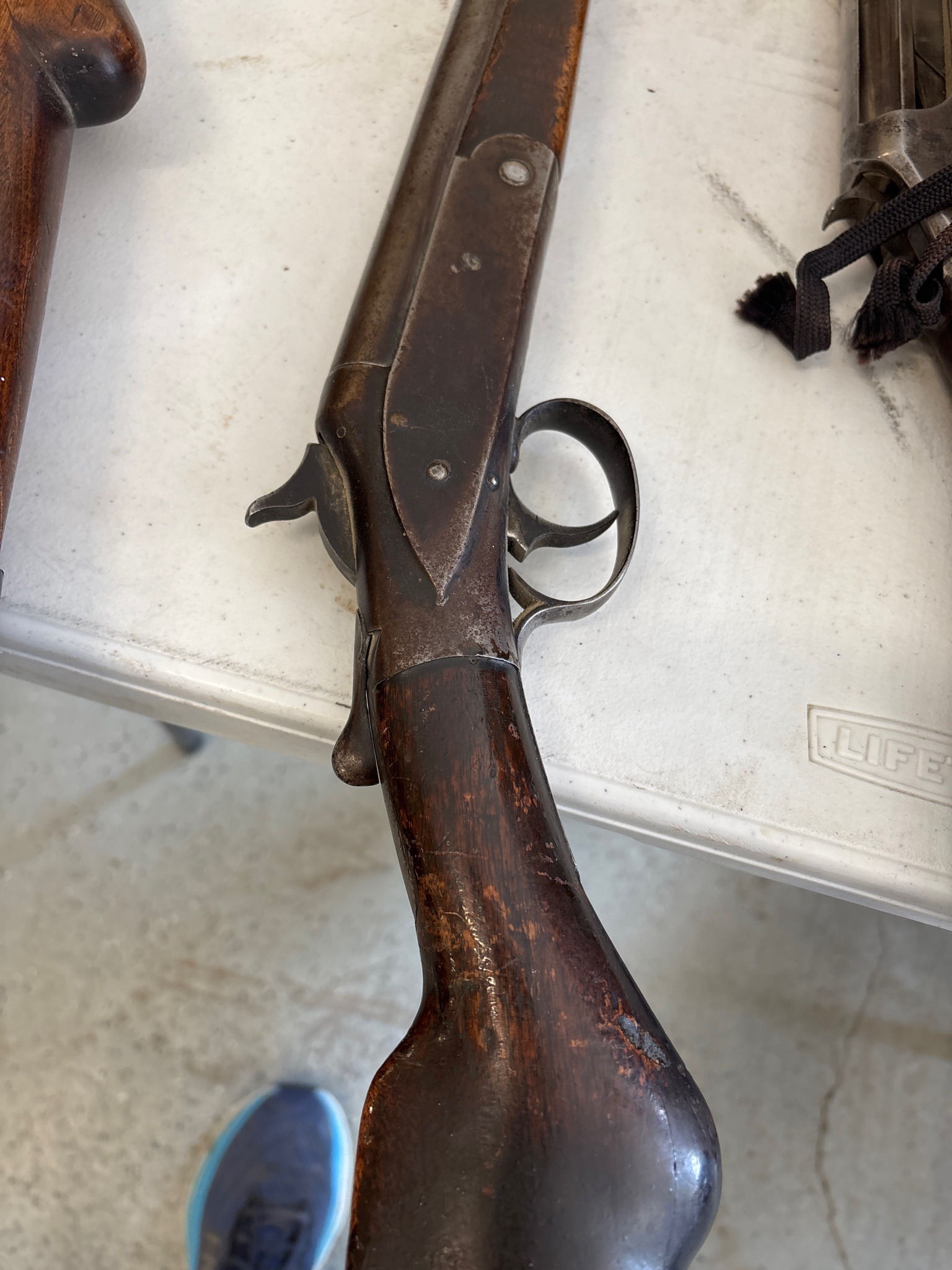 This is a vintage single-shot, break-action shotgun, likely an Iver Johnson Champion model produced in the early to mid-20th century. The firearm features a side-cocking hammer design and a steel frame with a trigger guard that shows significant age-related wear. The metal surfaces exhibit a heavy, dark brown patina and areas of pervasive surface oxidation (light pitting), particularly on the receiver and the hammer. The wooden stock is finished in a dark, reddish-brown stain and displays extensive wear, including numerous scuffs, shallow gouges, and a loss of varnish across the grip area. The wood-to-metal fit at the tang shows signs of shrinkage or compression consistent with age and storage in varying humidity. The barrel is a single tube constructed of forged steel, though any specific choke or gauge markings are obscured in the view. The action lever is located on the top tang, and the overall construction reflects a utilitarian, mass-market firearm intended for field use. The condition is considered 'fair' for its age, showing heavy seasoning and significant Honest wear, but no immediate catastrophic structural failures are visible in the photograph. It serves as a representative example of American sporting arms from the transition period between the Victorian era and the modern industrial age.