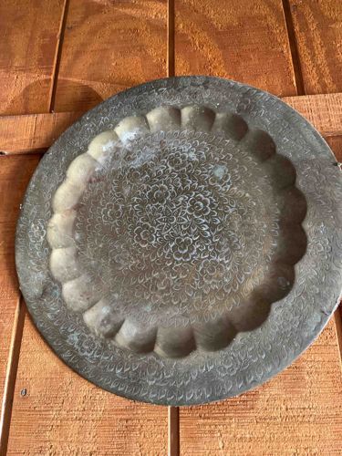 This item is a circular, hand-crafted metal tray or charger, likely made of a brass or copper-based alloy. It features a prominent scalloped or lobed inner rim that creates a secondary, recessed central well. The entire surface is densely decorated with fine, hand-etched or chased floral and foliate motifs, characteristic of Indo-Persian (likely Indian or Middle Eastern) metalwork. The central medallion consists of interlocking flower blooms and scrolling leaves, while the outer flat rim features a repeating petal-like and floral border. The metal displays a heavy, aged patina with significant oxidation, including visible verdigris (greenish spots) and dark tarnish, suggesting several decades of age, likely mid-20th century or earlier. There is noticeable surface wear, including light scratches, some pitting, and uneven coloration, which points to substantial handling and environment-related aging. No obvious maker's mark is visible from the top view, but the craftsmanship indicates a traditional repoussé and engraving technique. The piece possesses a rustic aesthetic with its irregular scalloping and hand-etched detail, showing the imperfections typical of manual artisan production rather than modern machine stamping.