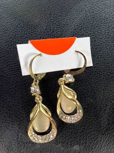 A pair of decorative dangle earrings featuring a gold-tone metal base with a lever-back or hook fastening. Each earring showcases a central synthetic cat's eye or moonstone-style glass cabochon, identifiable by its milky, chatoyant reflection. The cabochon is seated within a teardrop-shaped metal frame that curls around the stone. Below the central stone, the frame is accented with a pave-style arrangement of clear round-cut rhinestones or crystals, likely glass or cubic zirconia. An additional larger clear stone is set at the pivot point between the hook and the dangle. The metal has a bright polished yellow gold finish, though there is visible surface wear and slight dulling on the hooks, suggesting they are gold-plated or costume-grade base metal. The construction appears to be machine-cast, typical of late 20th-century or contemporary fashion jewelry. There are no immediate maker's marks visible on the front or the side of the settings. The pair is displayed on a white cardboard retail tag with an orange circular sticker, indicating they may be secondhand or thrifted. Stylistically, they draw inspiration from Art Nouveau organic forms but with a modern mass-market execution.