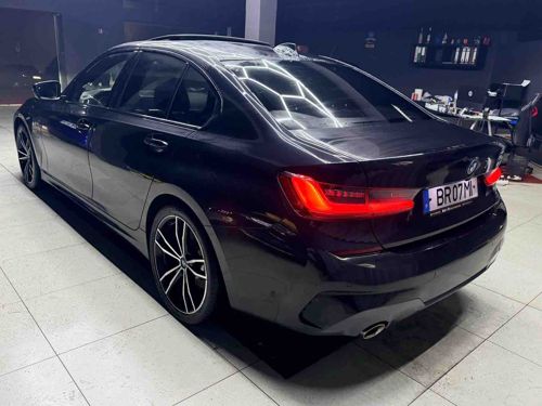 This is a modern BMW 3 Series sedan, specifically identified as the G20 generation, finished in a deep black metallic or gloss paint. The vehicle exhibits the brand's athletic design language with a prominent shoulder line, a tapered greenhouse, and the signature Hofmeister kink on the C-pillar. The rear profile features slim, darkened L-shaped LED taillights and a dual-exit exhaust system with integrated chrome tips. It is equipped with large, multi-spoke alloy wheels featuring a diamond-cut finish over dark grey or black accents. A shark-fin antenna is visible on the roof, alongside a sunroof. The vehicle appears to be in excellent aesthetic condition, likely recently detailed given the high-gloss reflection from the shop's hexagonal lighting fixtures. There are no obvious signs of major dents, scratches, or wear. The license plate indicates it is likely registered in Romania (BR prefix). This generation was introduced around 2018, marking it as a premium modern executive compact car characterized by high-build quality and advanced German engineering.