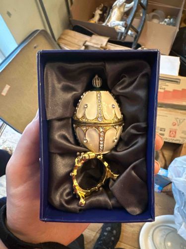 This item is a contemporary decorative collector's egg titled 'Nest of Pearls,' produced by Atlas Editions. The piece is inspired by the opulent designs of Peter Carl Faberge and is presented in a mint-condition, royal blue velvet-lined gift box. The egg features a high-gloss, cream-colored enamel finish accented by gold-tone metallic ribbing and scallops. It is heavily embellished with clear, faceted synthetic crystals or rhinestones that follow the vertical and horizontal structural lines of the piece. The egg consists of two halves connected by a central horizontal gold-tone band, suggesting it may open as a trinket box. It is topped with a decorative gold-tone finial. Accompanied by the egg is an ornate, three-legged gold-tone metal tripod stand designed with rococo-style scrolls. The materials appear to be cast metal with enamel and machine-cut glass accents. The overall condition is excellent, showing no signs of wear, stone loss, or enamel chipping, consistent with its 'mint condition' description. This piece represents the 20th or 21st-century revival of Imperial Russian aesthetic styles intended for the collectibles market.