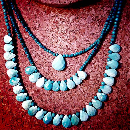 This sophisticated three-strand necklace features a combination of faceted briolette-cut turquoise drops and smooth round turquoise beads. The innermost strand highlights a single large center drop, while the middle and outer strands feature graduated bib-style arrangements of faceted droplets. The stones exhibit a range of natural blues and greens, with some visible matrix characteristic of genuine turquoise. The briolettes are meticulously faceted, creating a sparkling effect that contrasts with the smaller, dark teal-colored round spacer beads. The necklace is constructed on fine jewelry wire or thread, likely terminating in sterling silver findings such as a lobster or decorative clasp. The craftsmanship is high-quality, evident in the uniform graduation of the stones and the precise spacing of the beads. The style suggests a modern interpretation of Southwestern or bohemian jewelry, likely produced within the last 10-20 years. The condition appears excellent with no visible chips to the facets or frayed stringing. The use of sterling silver for structural components identifies it as fine artisanal jewelry rather than costume ware.
